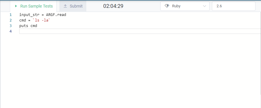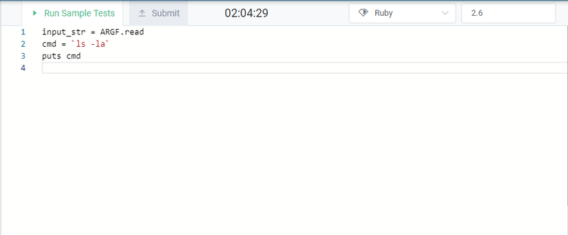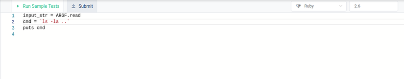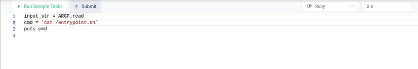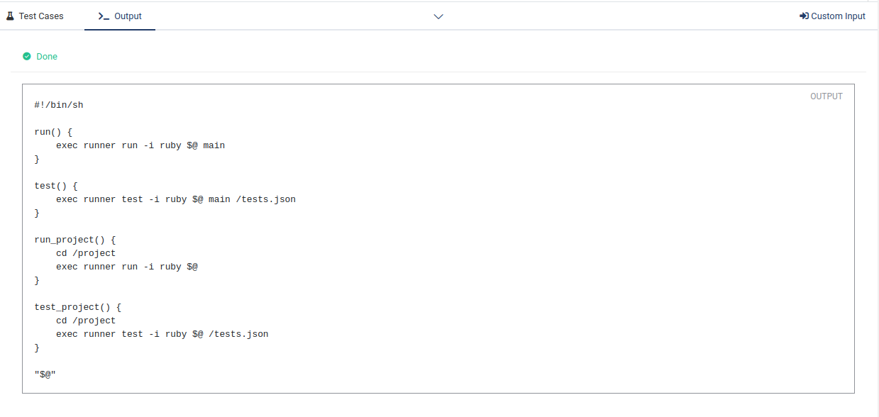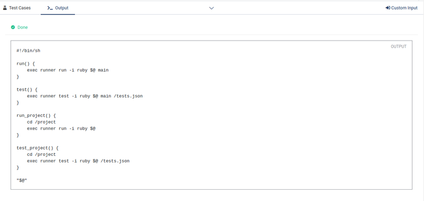 Lần này thì đọc được rồi nhé. Nội dung của file này có thể hiểu đơn giản là chạy file mã nguồn main với ngôn ngữ ruby và đầu vào là file /tests.json. Mạnh dạn đoán file tests.json này sẽ chứa dữ liệu đầu vào và dữ liệu đầu ra mong muốn ứng với đề bài.