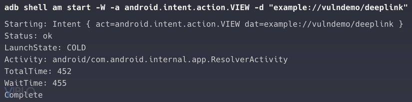 Ở hình dưới đây, mình sử dụng ADB để kích hoạt Deep Link trên môi trường ảo hoá. Điều tương tự sẽ xảy ra khi mở Deep Link qua việc truy cập từ trình duyệt, ứng dụng ghi chú, tin nhắn,...