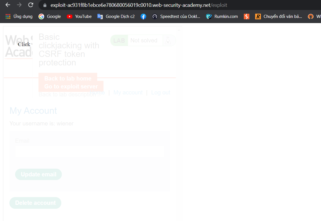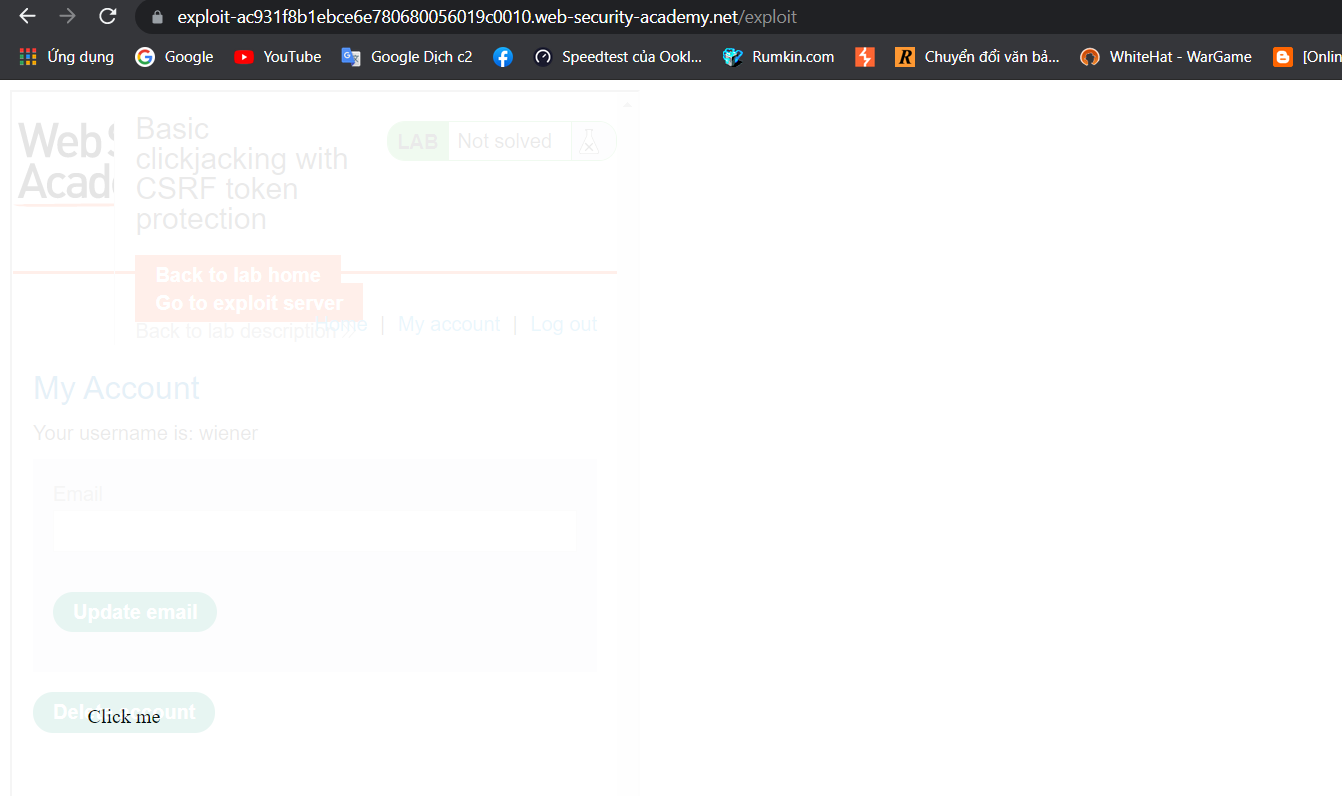 Chỉnh sửa opacity: 0.0001; để làm ẩn trang web cần khai thác và chọn Deliver exploit to victim để gửi cho nạn nhân. Khi nạn nhân truy cập vào trang web và bấm vào Click me thì sẽ bị xóa tài khoản và hoàn thành bài lab.