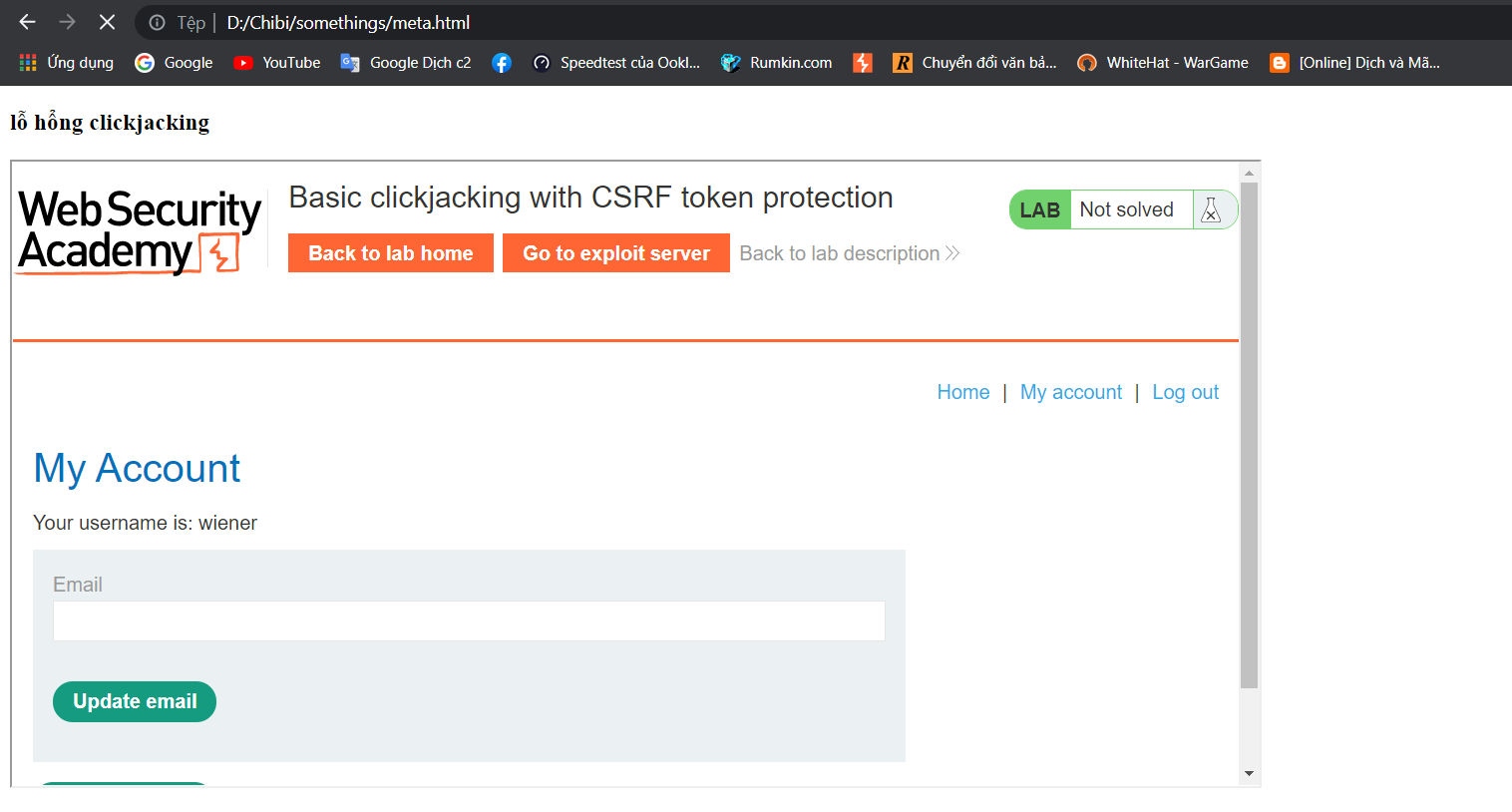 Đầu tiên đăng nhập vào trang web với username=wiener&password=peter. Trang web sẽ điều hướng tới trang web của người dùng. Ta thực hiện kiểm tra tương tự bước b bằng cách nhúng trang web vào 1 frame: