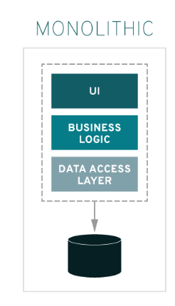 Đây là kiến trúc mà chúng ta thường dùng để xây dựng phần mềm. Toàn bộ các module (view, business, database, report) đều được gom chung vào một project lớn. Khi deploy, sẽ đẩy khối code này lên server và config để nó chạy