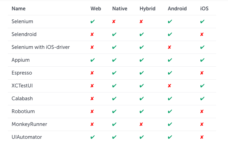 Có rất nhiều công cụ có sẵn để thử nghiệm di động. Họ sử dụng các công nghệ khác nhau để tạo và chạy thử nghiệm. Sự đa dạng của các tính năng được hỗ trợ là tuyệt vời. Các công cụ khác nhau hỗ trợ các hệ điều hành khác nhau, các loại ứng dụng khác nhau, thiết bị thực, trình giả lập và trình giả lập. Một số trong số chúng là open source và một số trong số chúng là thương mại. Một số công cụ chạy trên cloud, một số khác chạy cục bộ. Danh sách này chỉ là tổng quan về một số khung thử nghiệm hiện có và khả năng sử dụng web và Native app của chúng.