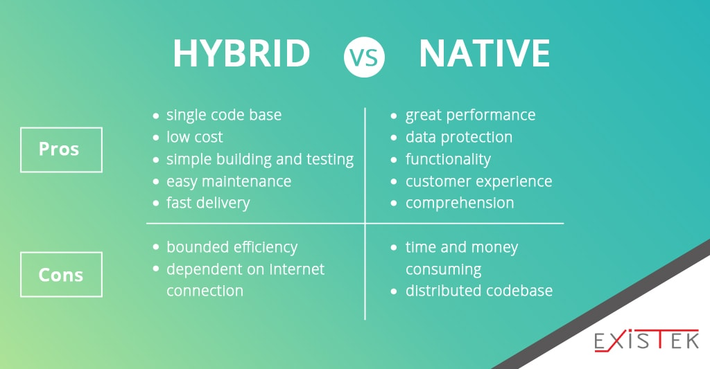 Xem xét tất cả các ưu và nhược điểm của Native app và Hybrid app, các nhà phát triển có thể đề xuất phương pháp phù hợp để đáp ứng yêu cầu của bạn. Những ứng dụng đó được đặc trưng bởi hiệu suất nhanh hơn và bảo mật tốt hơn, nhưng chu kỳ phát triển sẽ chậm hơn. Ngoài ra, mỗi nền tảng sẽ có một codebase riêng, điều này sẽ làm tăng sự đầu tư về tiền bạc và thời gian.