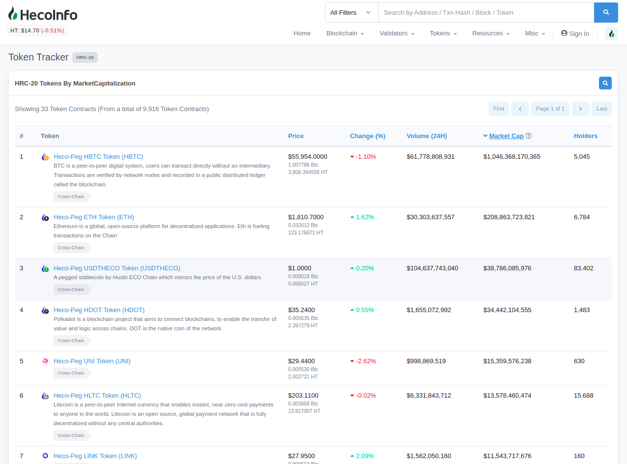 Hiện các tokens top ở bên ETH đã có mặt trên Heco chain như Uni, Usdt, Link,...