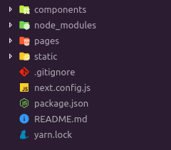 components: như cái tên thì nó sẽ là nơi chức các component cho ứng dụng của chúng ta.pages: đây là nơi chứa các trang mà chúng ta truy cập từ url vào, cụ thể mình sẽ nói đến ở dưới.static: là thư mục chứa các file static của chúng ta như ảnh, css, ...next.config.js: cũng như cái tên thì nó là fie chứa config cho ứng dụng của chúng ta.