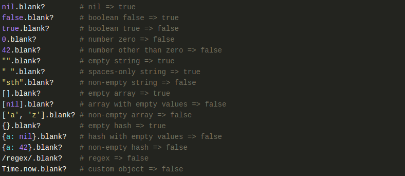 Một đối tượng là blank khi nó nil hoặc false , ngoài ra Array và Hash là blank khi chúng là empty.