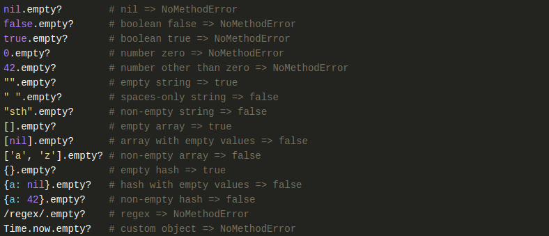 .empty? là một phương thức Ruby, chỉ hoạt động với Hash, Array hoặc String. Nhưng không phải cho mọi Enumerable. Nó trả về true nếu kích thước size lớn hơn 0. Đối với những trường hợp khác nó trả về một NoMethodError.