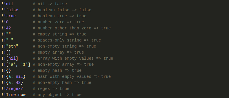 Nói cách khác nếu bạn ép kiểu nil hoặc false là boolean, nó sẽ trả về false. Mọi loại giá trị khác đều được coi là true trong Ruby . Điều nảy xảy ra không chỉ dành riêng cho Ruby, nó còn hoạt động với JavaScript.