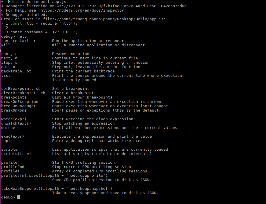 Khi chạy node inspect app.js node sẽ hiện lên 3 dòng đầu của file