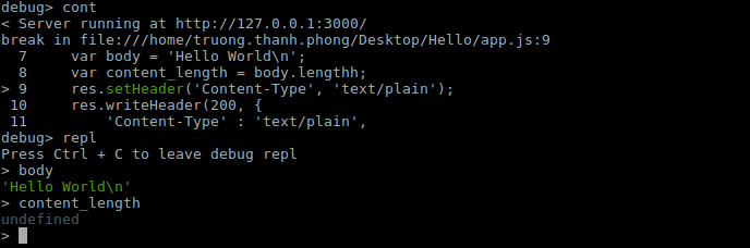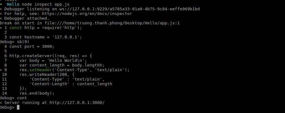 Quay trở lại browser, reload và quay lại terminal ta sẽ thấy đoạn code sẽ được thực hiện đến dòng số 9