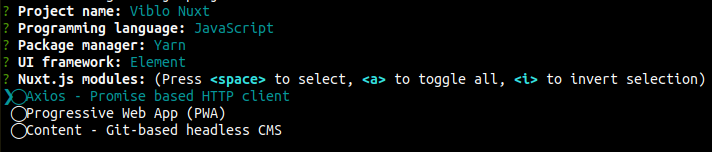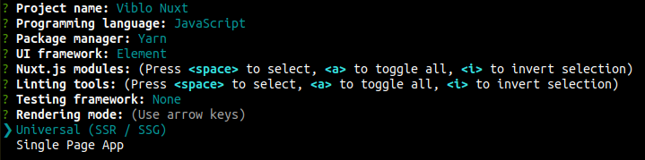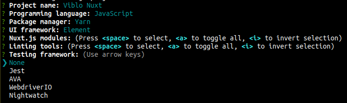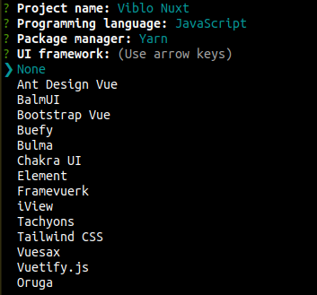 Đối với NextJS trước kia khi tạo project mới thì ta chỉ cần gõ một lệnh tương tự như trên và đợi giây lát để nó tạo project mới thì với NuxtJS sẽ hỏi chúng ta về các config và cài đặt các third-party library mà thường thường chúng ta sẽ cần cài đặt như sau: