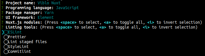 Ở bước này bạn có thể chọn linting tool cho project của mình từ việc check code js, css đến cả validate commit message cho git