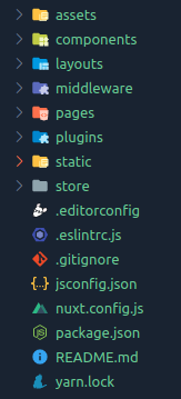 .eslintrc.js,package.json, ... và đặc biệt còn filenuxt.config.jssẽ là file config riêng choNuxJStrong dự án của bạn. Sơ qua thì về cấu trúc thư mục chúng ta sẽ có như ở trên và bạn hoàn toàn có thể tạo thêm các thư mục khác tùy theo nhu cầu của bạn.