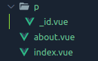 Trong project thực tế của chúng ta thì không phải url lúc nào cũng dạng static như các ví dụ nói trên của mình mà sẽ còn có các các tham số trên url nữa. Lấy luôn ví dụ của trang viblo mà các bạn đang sử dụng. Với trang chủ ta có url dạng viblo.asia tuy nhiên khi bạn đọc truy cập vào đọc các bài viết cụ thể sẽ thế url có dạng viblo.asia/p/[slug-hashId]. Như bạn biết thì với mỗi bài viết thì phần slug-hashId sẽ khác nhau và chúng ta không thể nào ngồi tạo ra một đống file có dạng [slug-hashId].vue được. Chính vì thế với cấu trúc như nói trên thì ta sẽ cần tạo cấu trúc thư mục như sau: