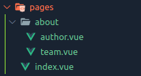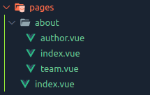 Với cấu trúc router dạng như trên thì ta đơn giản sẽ tạo ra thêm một thư mục tên là about/ và trong đó ta lần lượt tạo ra hai file là author.vue và team.vue: