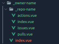 Phần này có thể mình giải thích hơi khó hiểu một chút nhưng nếu bạn tự sử dụng thử thì sẽ thấy nó vô cùng đơn giản và dễ hiểu. Không những ta có thể tạo ra các file dạng dynamic như _id.vue nói trên mà ta còn có thể tạo ra các folder dynamic bằng cách đặt tên với quy tắc như nói trên. Ta xét ví dụ thực tế đó là một repository bất kì của bạn trên Github của mình sẽ truy cập vào repository có là https://github.com/dqhuy78/to-do-list, ở đây dqhuy78 là user name của mình và to-do-list chính là tên repository của mình.