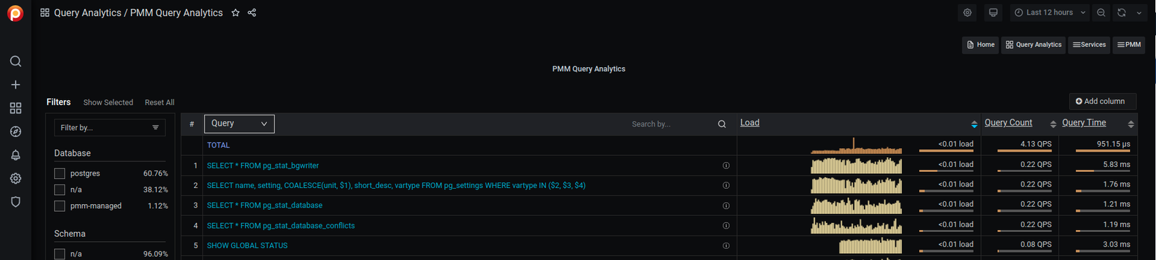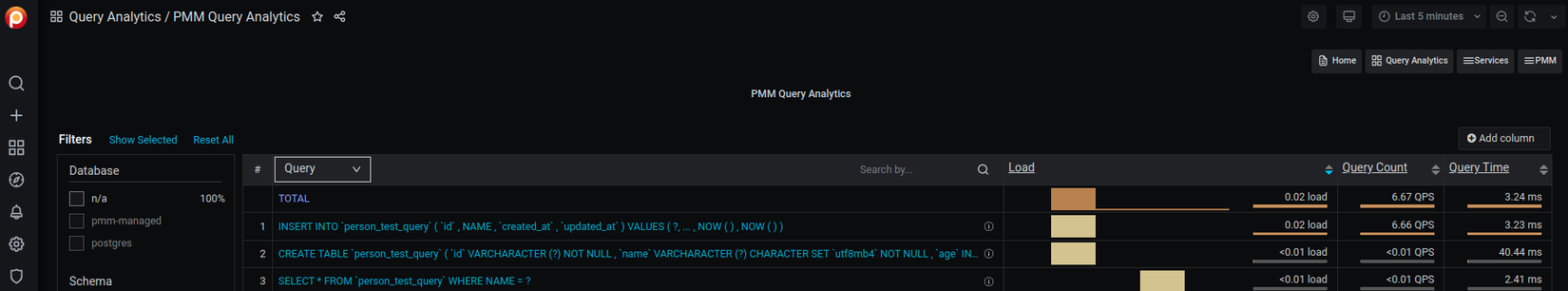 Ok, giờ để monitoring được các SQL trong database, mình vào màn hình http://localhost:9090/graph/d/pmm-qan/pmm-query-analytics để xem các query được execute.
