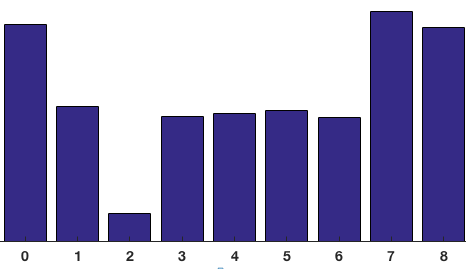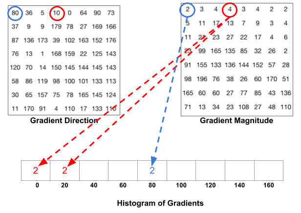 Như trong hình ảnh trên, đầu tiên là pixel có bao quanh màu xanh lam. Nó có hướng 80 độ và cường độ là 2, vì vậy ta thêm 2 vào bin thứ 5 (hướng 80 độ). Tiếp theo là pixel có bao quanh màu đỏ. Nó có hướng 10 độ và cường độ 4. Vì không có bin 10 độ, nên ta vote cho bin 0 độ và 20 độ, mỗi bin thêm 2 đơn vị. Sau khi vote hết các pixel trong một cell kích thước 8x8 vào 9 bin, ta có thể thu được kết quả như sau: