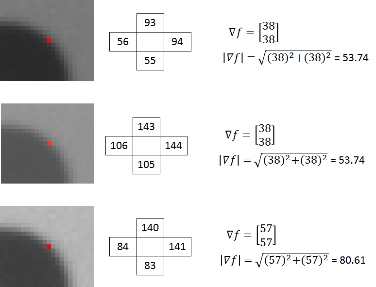 Hãy nhìn vào các giá trị pixel thực tế và sự thay đổi của vector gradient của ba trường hợp trên trong hình ảnh sau: