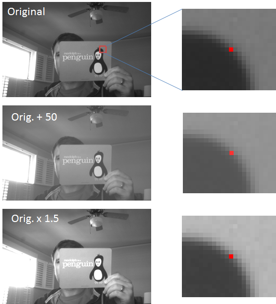 Trong hình ảnh trên, trường hợp đầu tiên là một ô của hình ảnh ban đầu. Trường hợp thứ hai, tất cả các giá trị pixel đã được tăng lên 50. Trong trường hợp thứ ba, tất cả các giá trị pixel được nhân với 1.5. Dễ dàng thấy được, trường hợp thứ ba hiển thị độ tương phản gia tăng. Ảnh hưởng của phép nhân là làm các điểm ảnh sáng trở nên sáng hơn nhiều, trong khi các điểm ảnh tối chỉ sáng hơn một chút, do đó làm tăng độ tương phản giữa các phần sáng và tối của hình ảnh.