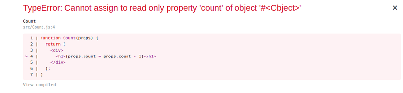 Thì ngay lập tức React sẽ báo lỗi TypeError: Cannot assign to read only property 'count' of object '#<Object>'