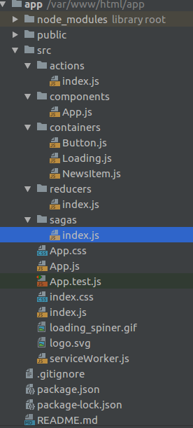 Khi hành động ‘GET_NEWS, đã được gửi thuộc tính state bằng với true và spinner xuất hiện trên màn hình. Tất nhiên, lệnh này sẽ được kích hoạt và sau khi phản hồi đã đến hành động NEWS_RECEIVED được gửi đi. Redux-Saga sẽ quan tâm đến tất cả những điều này. Tiếp theo, hãy cùng đến với tập tin chính của hướng dẫn SAGA này.