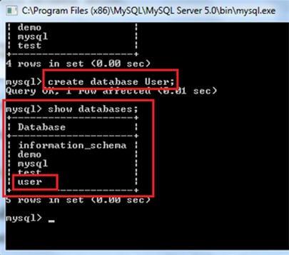 Bước 2: Gõ "create database user;” tạo 1 database có tên là "user".