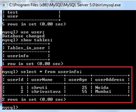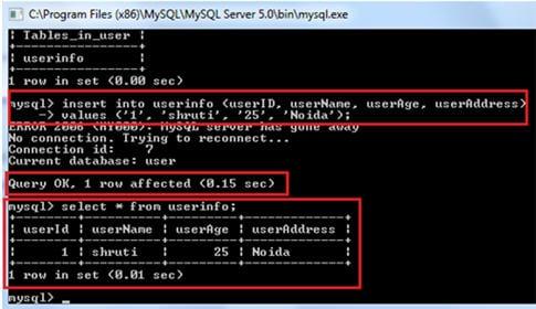 Bước 5: Nhập lệnh sau để insert dữ liệu cho tất cả bốn trường cột (userId, userName, userAge, userAddress).