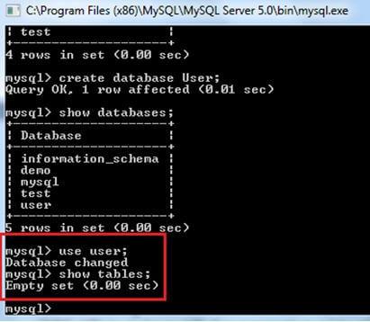 Bước 3: Gõ "use user;" để chọn cơ sở dữ liệu mới được tạo sau đó gõ "show tables;" để xem tất cả các bảng có sẵn trong cơ sở dữ liệu.