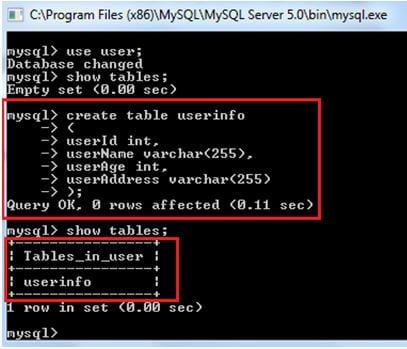 Bước 4: Nhập lệnh sau để tạo 1 bảng có 4 cột (userId, userName, userAge, userAddress).