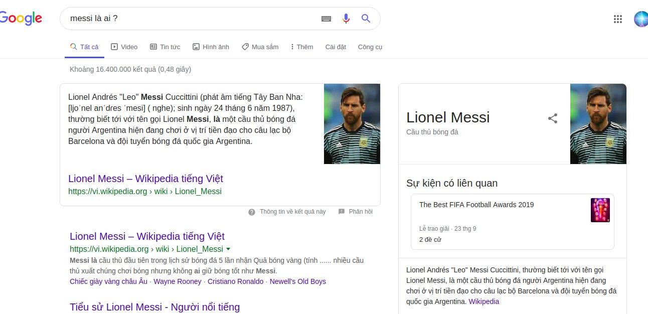 Khi bắt đầu với câu hỏi: "Messi là ai ?", chẳng cần đầy đủ là Lionel Messi, mà google đã trả về đúng kết quả mà ta cần tìm, hiển thị ngay ở ngoài tìm kiếm, mà chẳng cần click vào nguồn dữ liệu(Để ý bạn sẽ thấy dữ liệu này là của Wikipedia). Chắc hẳn bạn đã thấy việc này rồi đúng không ? Thời gian gần đây, khi hỏi về thời tiết, ngày giờ, google đã trả về kết quả trực tiếp mà không cần nguồn nữa. Khác biệt ở đây chính là dữ liệu đã được "ngữ nghĩa hóa" ! . Việc ngữ nghĩa hóa này cần thực hiển ở 2 phía: Một là bên Search Engine (Tiêu biểu là Google) phải áp dụng công cụ tìm kiếm ngữ nghĩa, Cái thứ 2 (Quan trọng hơn) là Website mang thông tin phải được mô hình hóa thành dữ liệu ngữ nghĩa. Tiêu biểu hiện nay là Wikipedia đã chuyển toàn bộ dữ liệu của mình thành dữ liệu ngữ nghĩa.