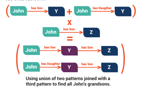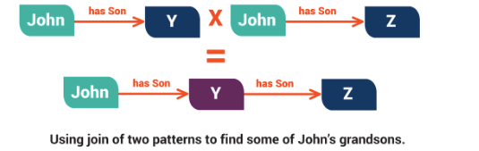 Tuy nhiên, các con trai của các con gái của John sẽ không được trả về vì mẫu cơ bản đầu tiên trong truy vấn, ấy là ‘John’ → ‘có con trai’ → Y, sẽ không khớp với bộ 3 trong dữ liệu như ‘John’ → ‘có con gái’ → ‘Anna’. Vì thế thậm chí nếu, ‘Anna’ → ‘có con trai’ → ‘Timmy’, thì Timmy sẽ không được hiển thị như là giải pháp của sự liên kết ở trên. May thay, mẫu đồ họa đan xen và mẫu đồ họa nhóm có thể dễ dàng kết hợp được với nhau. Vì thế liên minh của ‘John’ → ‘có con trai’ → Y và ‘John’ → ‘có con gái’ → Y được nhóm với Y → ‘có con trai’ → Z sẽ tìm thấy tất cả các cháu của John.
