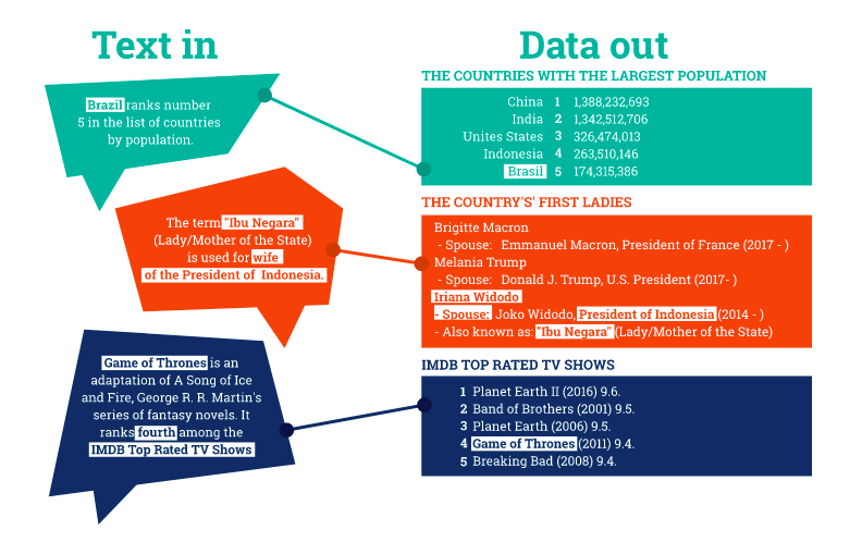 Thông qua việc trích xuất thông tin, các sự kiện cơ bản sau đây có thể được trích xuất văn bản và được tổ chức dưới dạng có cấu trúc, dễ đọc bằng máy:
