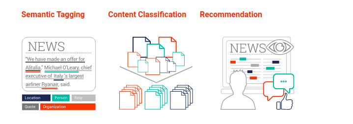 Việc khai thác và đưa ra thông tin thường được thực hiện qua 3 bước : Tagging , Content Classification và Recommendation .