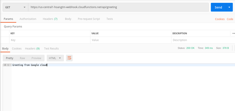 functions.https.onRequest sẽ bắt được sự kiện khi có request đến, với router app.get('/greeting'), callback được truyền vào function này sẽ được gọi và trả về string 'Greeting from Firebase Google cloud' qua response.send()