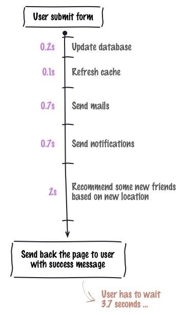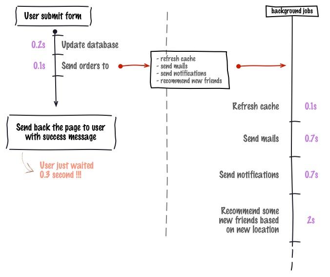 Hình ảnh trên mô tả những tác vụ mà một trang web phải xử lý khi mà một người dùng submit một cái form. Nó tốn đến 3.7s cho tất cả các tác vụ trên, khá mất thời gian đúng không nào. GIờ ta cùng xem tiếp một hình ảnh khác về việc trang web sử dụng background job