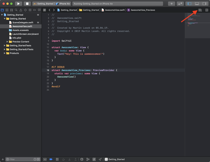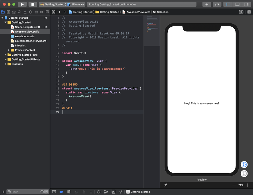 (1) Là khởi tạo một UIWindow mới với size của màn hình iPhone và truyền nó tới biến window. (2) chúng ta khởi tạo một UIHostingController, nó là một ViewController nhưng có khả năng giữ SwiftUI View. Ở đây chúng ta truyền qua một instance của AwesomeView mà chúng ta muốn nó hiển thị trên View đầu tiên. Cuối cùng chúng ta sẽ "make the window key and visible" có nghĩa là đây là cửa sổ hoạt động của ứng dụng.