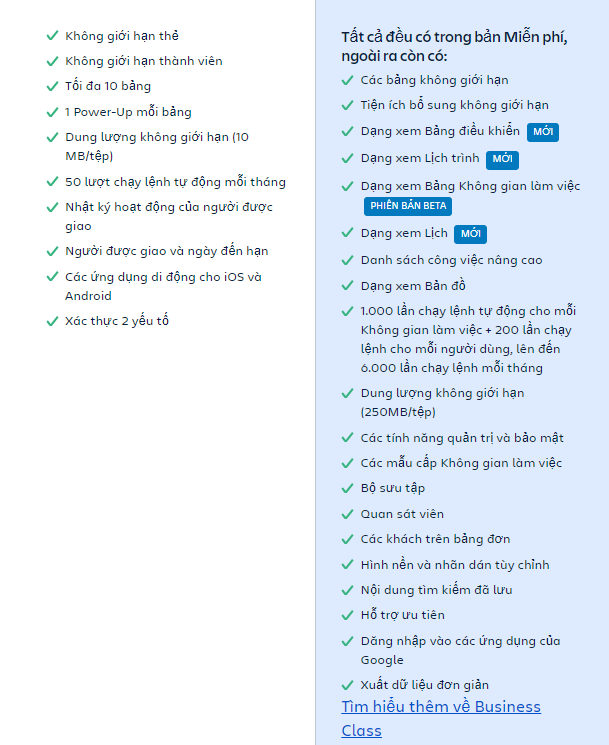 Để tận dụng tất cả khả năng và tính năng của Trello, bạn cần phải trả 1 khoản giá duy trì 10$/người/tháng cho gói Bussiness Class.