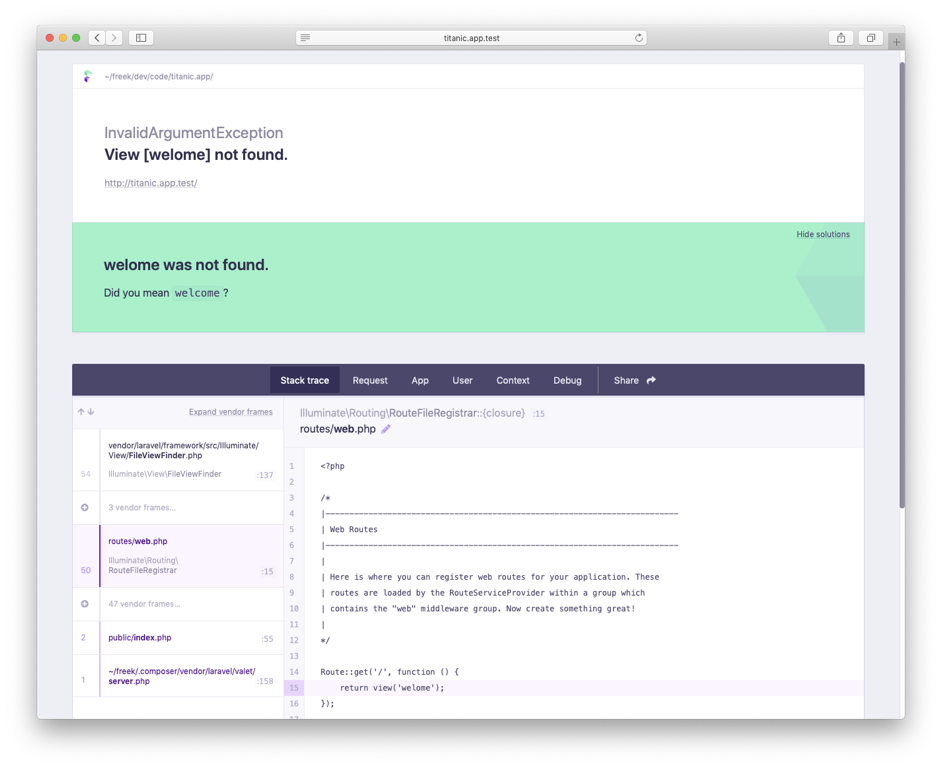 - Ignition lại cung cấp một giải pháp hoàn toàn khác, mà chỉ nhìn vào kết quả thôi, thì chúng ta, những người gõ phím kiếm tiền sẽ cảm thấy vô cùng dễ chịu. Ignition đưa ra đường dẫn trước khi complied và đó chính là đường dẫn chính xác file .blade nào chúng ta đang bị lỗi trong thư mục dự án, ngoài ra, nội dung hiển thị lỗi cũng chỉ ra chính xác dòng code trong file .blade nào gây lỗi. Tất nhiên cũng là dòng code chưa compiled. Điều này giúp chúng ta dễ dàng định hình và sửa chữa code một cách nhanh chóng hơn nhiều.