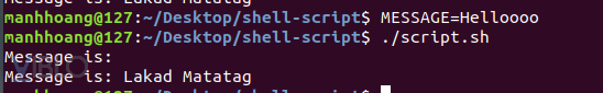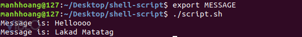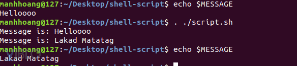 Nhưng khi file shell script chạy xong, mình echo $MESSAGE thì vẫn sẽ ra kết quả là Helloooo. Để có thể nhận được sự thay đổi từ shell script thì bạn cần chạy lệnh sau