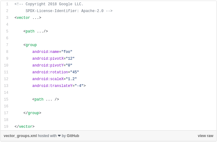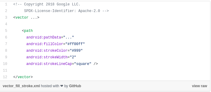 Ngoài ra, bằng cách xác định định dạng của riêng mình, VectorDrawable có thể tích hợp với các tính năng nền tảng Android. Ví dụ: làm việc với hệ thống tài nguyên Android để tham chiếu @colors, @dples hoặc @strings, làm việc với các thuộc tính chủ đề hoặc AnimatedVectorDrawable bằng Animators tiêu chuẩn.