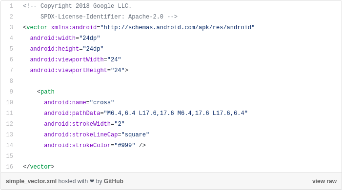 Như đã nêu, VectorDrawable hỗ trợ đặc tả đường dẫn SVG, cho phép bạn chỉ định một hoặc nhiều hình dạng sẽ được vẽ. Nó có file XML giống như thế này: