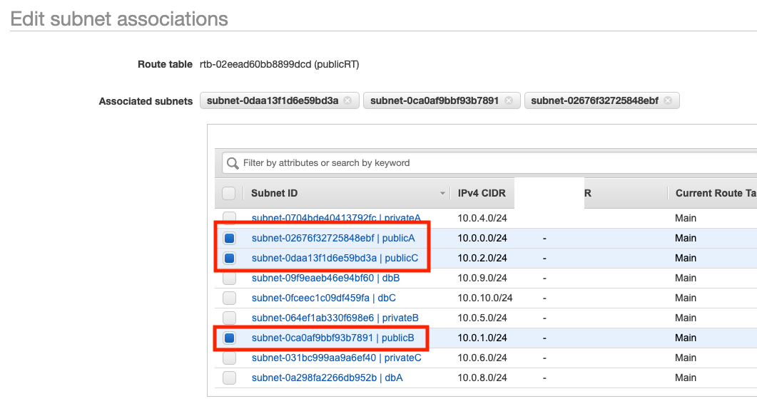 Gắn 3 subnets publicA, publicB, publicC vào Route table, điều này sẽ giúp kết nối các subnet này với Internet