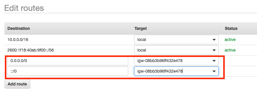 Thêm route cho Route table, với đích đến (Destination) là Internet sẽ đi qua Internet gateway đã tạo ở trên
