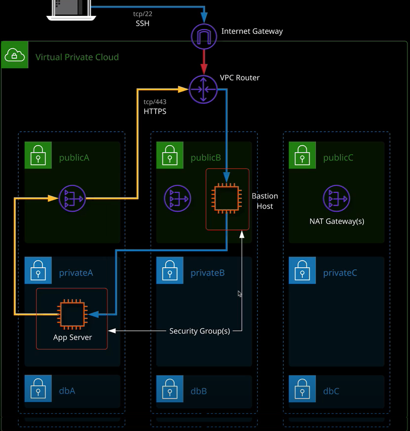 Dùng ssh truy cập vào Bastion Host, rồi từ Bastion Host truy cập sang App server, ping đến 1.1.1.1