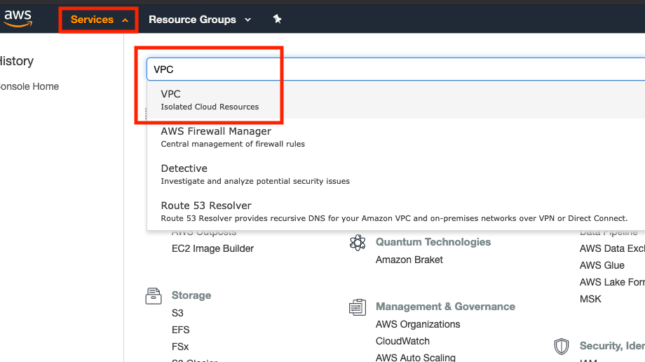 - Chọn dịch vụ VPC: Click vào Services, gõ