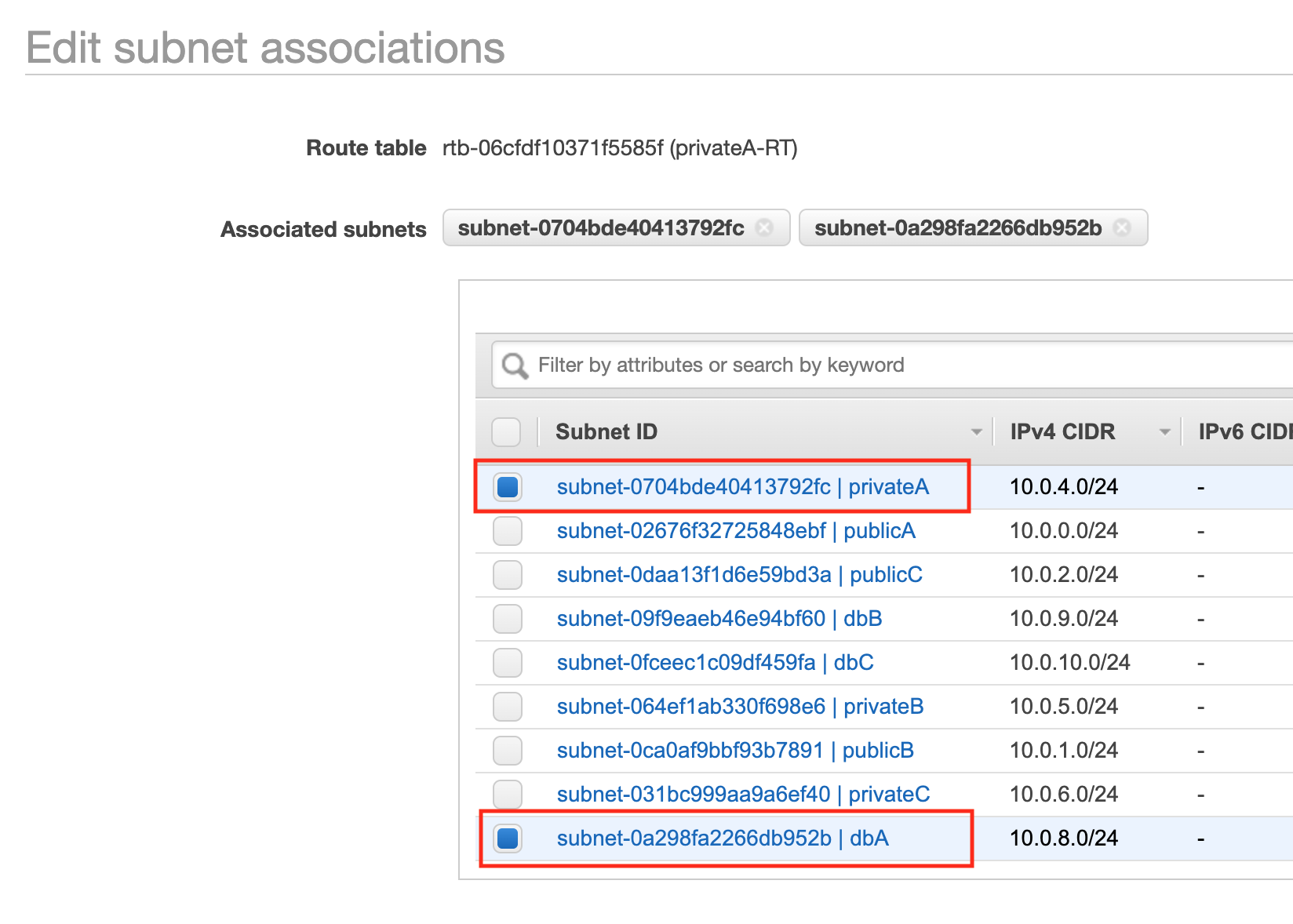 Thêm subnet privateA và dbA vào Route table tạo ở trên
