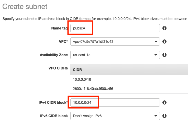 Tạo subnets: lần lượt tạo các subnets với các thông tin như sau: