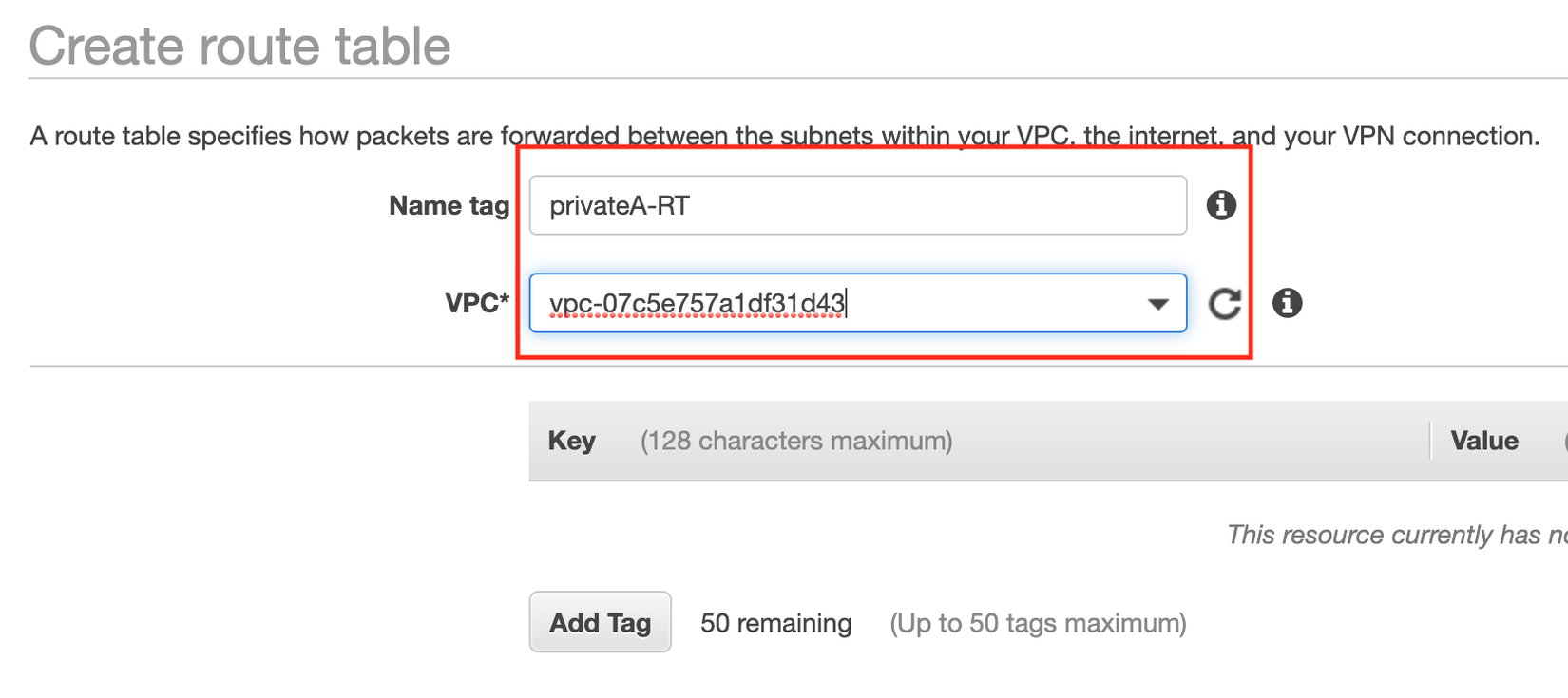 - Tạo Route table cho privateA, chọn VPC đã tạo từ trước