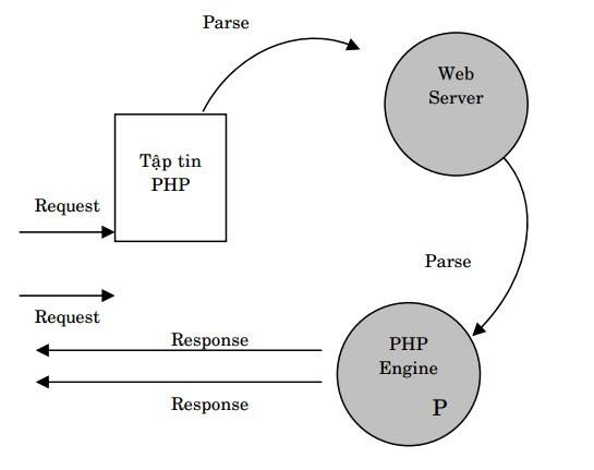 Khi người sử dụng gọi trang PHP, Web Server sẽ triệu gọi PHP Engine để thông dịch dịch trang PHP và trả kết quả cho người dùng như hình bên dưới.
